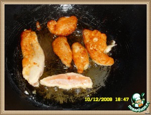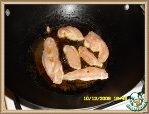 И обжарить полоски куриного мяса партиями, примерно 1-2 минуты