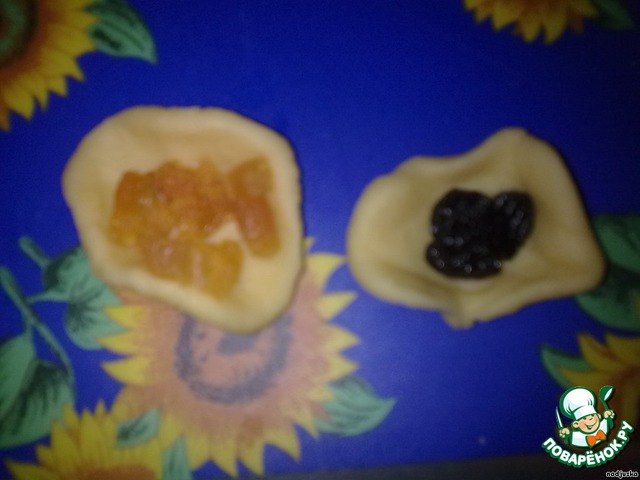 Разровнять кусочек и в середину вложить начинку из чернослива и кураги.