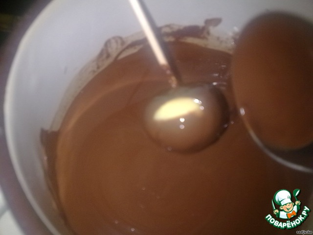 Приступим к "мундиру" для ежиков: накалываем шарик на шпажку и поливаем его шоколадом.