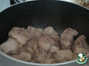 Свинину порезать средними кусочками, сложить в глубокую сковороду, закрыть крышкой, пусть выкипит жидкость образовавшаяся. По времени это 12-15 минут.