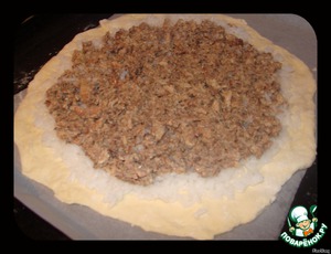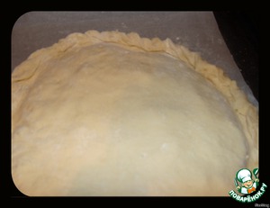 Накрываем второй частью теста, защипываем края, протыкаем вилкой в нескольких местах верх пирога, и отправляем его в заранее разогретую на 180 С духовку на 20-25 минут.