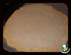 Делим тесто на 2 части и раскатываем. Устраиваем одну часть теста на смазанный растительным маслом пергамент.