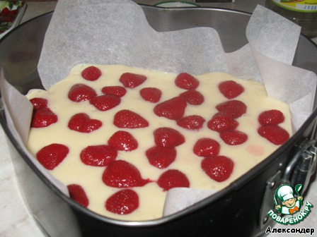 Вылить тесто в форму с бумагой для выпечки. Выложить клубнику и отправить в духовку. Клубника может быть любая: свежая, мороженная и из компота.