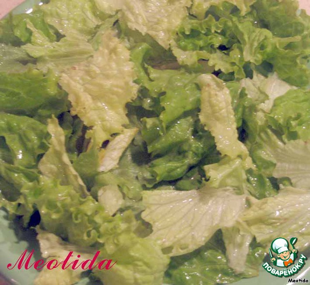 На тарелку выкладываем листья салата (рвем их крупными кусочками).