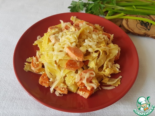 Макароны с колбасой и яйцами