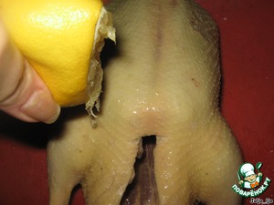 Теперь приступим, непосредственно, к приготовлению. Утку вымоем, посолим (внутри тоже не забываем посолить). Натираем её лимонным соком.