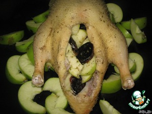 Утку натираем чёрным перцем и начиняем яблоками с черносливом.