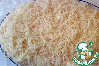 1 слой: Отваренный картофель натереть на терке и выложить слоем в виде головы и ушек.