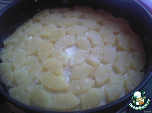 Мягкое масло, сахар и яйца взбиваем, добавляем муку, крахмал, соль, разрыхлитель, замешиваем мягкое тесто. Форму выстилаем бумагой для выпечки, выкладываем плод трудов наших (ну, или миксера). У меня форма 23 см, сначала показалось, что теста мало, но оно хорошо поднимается. Ананас высушиваем, режем каждый кружочек на 4 части, выкладываем на тесто.
