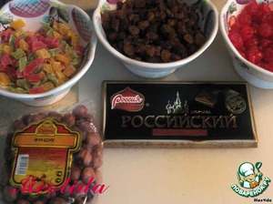 добавляем в оставшуюся творожную массу шоколад, цукаты, орехи, вишню, изюм, убираем начинку в холодильник, пока занимаемся приготовлением и пропиткой коржей -
