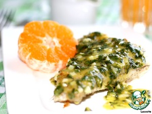 Из апельсина и мандарина выжать сок (130мл), растворить в соке сахарный песок. Муку развести в 50мл воды. Влить сок к зелени, слегка выпарить, добавить мучную массу, довести соус до кипения и снять с огня.