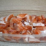 Утром достаем рыбу из холодильника. Она дает сок, это видно на фото. Её уже можно пускать в употребление. Часть рыбы можно убрать в морозилку. Своих вкусовых качеств после заморозки она не теряет.