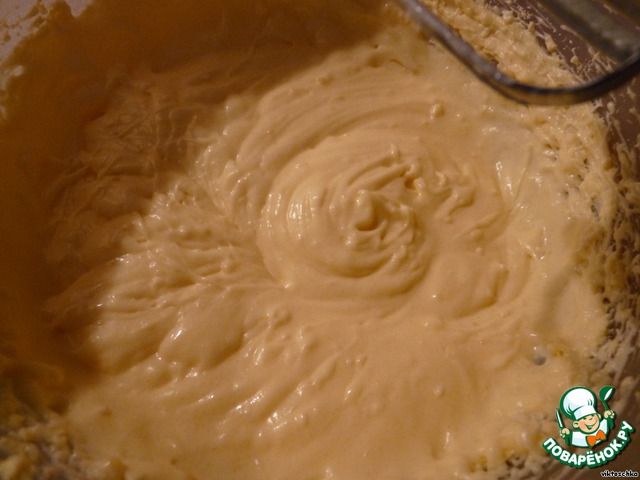 Для теста взбить яйца с сахаром. Медленно добавить масло. Поочередно добавить молоко и муку.