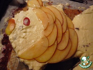 Яблоко порезать тоненькими дольками и выложить чешуйку и коронку.
