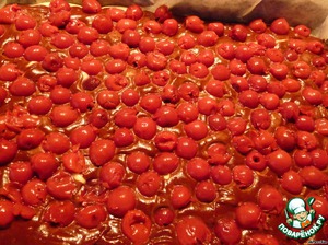Сверху выложить вишню и слегка вдавить в тесто. Выпекать при температуре 180°C 25-30 минут.