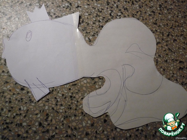 Пирог смазать кремом. По шаблону вырезать рыбку.