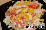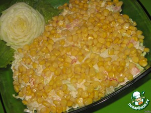 Смешать все ингредиенты, добавить кукурузу и пропущенный через пресс чеснок, заправить майонезом.