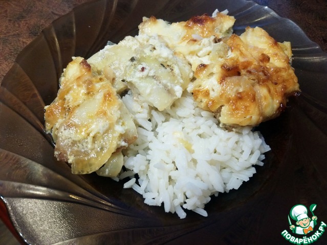 3. Форму для запекания смазываем маслом и укладываем слоями: сначала рыбу, на нее лук. Каждый луковый слой промазываем соусом (сметана и майонез), посыпать солью и специями. Таким образом получается 4-6 слоев.