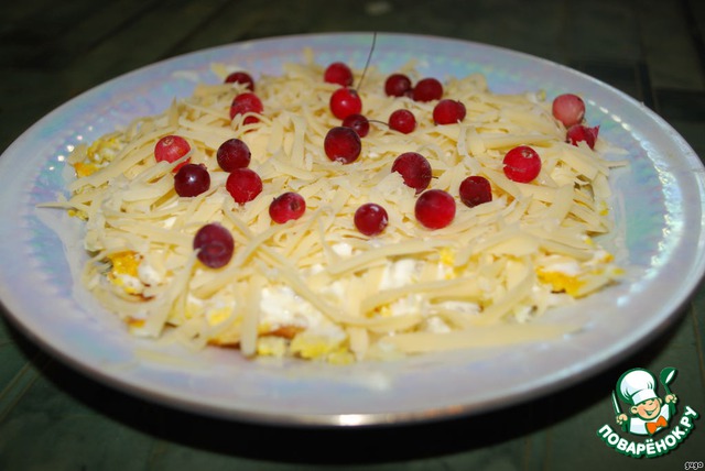 Сверху присыпаем тертым сыром и украшаем клюквой.