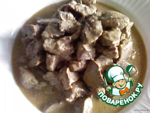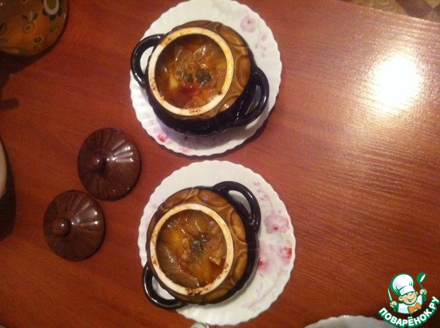 Полученную слоеную массу залить мясным солёным бульоном (чтобы её чуть-чуть покрыло) и поставить тушить 20-25 минут.