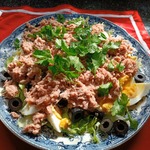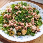 К жидкости из тунца добавляем сок 1/2 лимона, черный молотый перец и соль. Перемешиваем и поливаем наш салат. Рвем петрушку руками и обильно посыпаем. Все, салат готов.