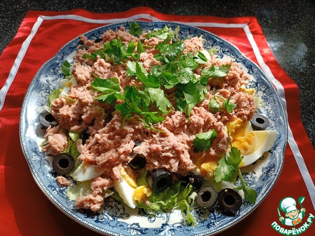 Открываем консервированный "тунец в собственном соку". Жидкость сливаем в мисочку, а сам тунец измельчаем и выкладываем горкой на салат.