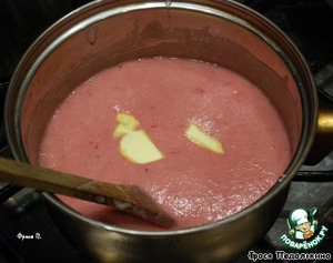 Держать на огне, постоянно помешивая, пока крем не загустеет. Снять с огня, добавить сливочное масло и охладить.