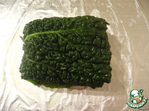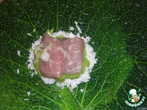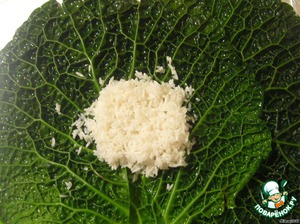 Разобрать капусту на листы, облить их кипятком, выложить на два капустных листа 50 г риса.