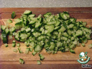 • Курицу отварить, охладить и нарезать меленько. Вообще, для этого салата все лучше резать помельче, от этого он становится только вкуснее.
