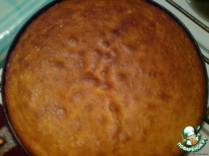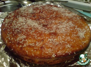 Пока корж горячий, разрезать на две половинки (я резала леской), первый промазать вареньем и накрыть вторым. Сверху посыпать стружкой кокосовой.