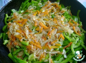 На него немного нашей зажарки, потом весь перец, а сверху оставшиеся лук с морковкой.