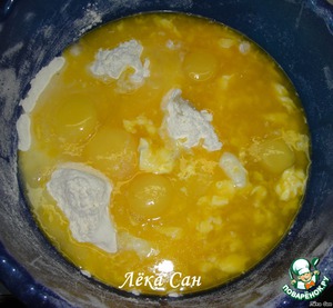 Туда же добавляем растопленный маргарин, яйца, желтки и соль.