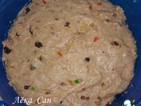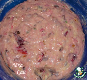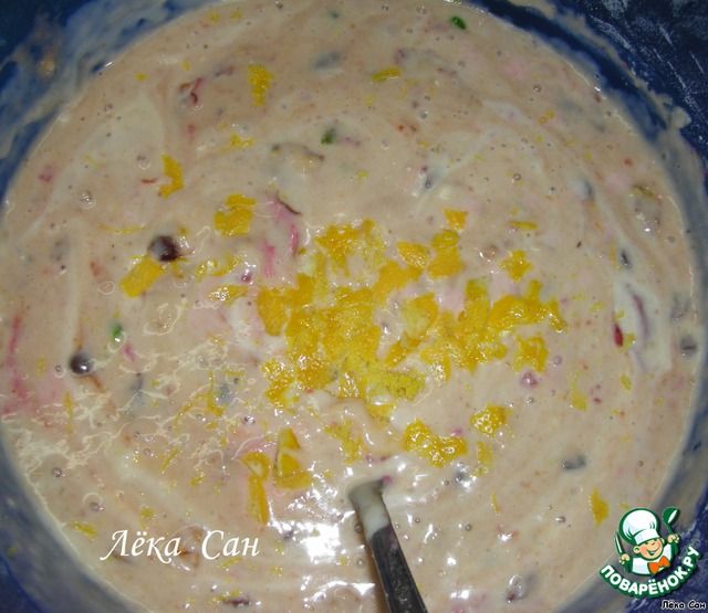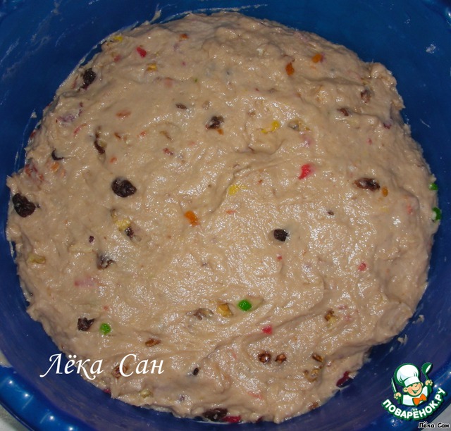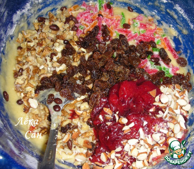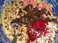 Добавляем распаренный изюм, грецкие орехи, сливы, часть цукатов и миндаля.