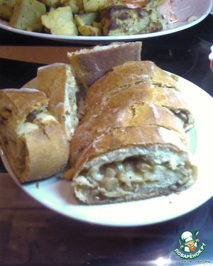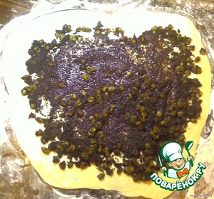 Раскатать как можно тоньше, разложить начинку, свернуть, края защипать. На противень уложить швом вниз. Смазать взбитым яйцом, молоком или подсолнечным маслом (про масло подсмотрела на поваренке - получается хорошо).