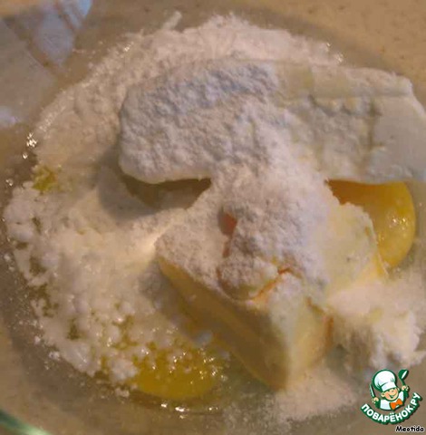 смешиваем творог, яйцо, маргарин (комнатной температуры), соль, молоко, куркуму и разрыхлитель до однородного состояния -