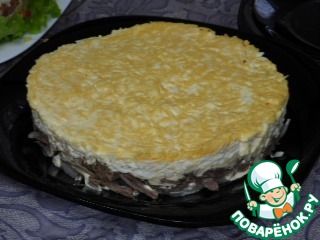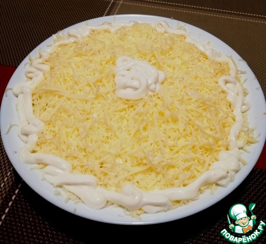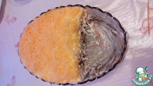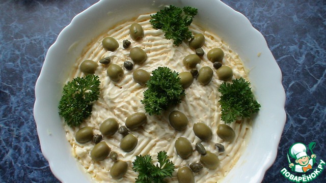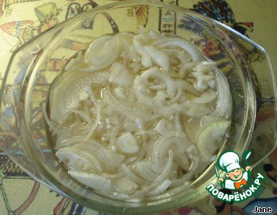 Луковицу нарезать полукольцами и выдержать в маринаде: 1 стакан воды, 1 ст. ложка 9%-ного уксуса.