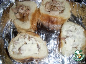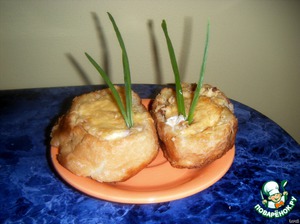 в углубления на донышко выложить грибы с луком, сверху мясо, смазать майонезом и поставить в духовку запекаться на 25 минут *в зависимости от духовки*