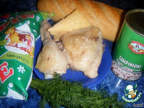 С отварного окорочка отделить мясо от костей и порезать кубиками.