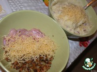 В остывшую массу 2/3 грибов и лука добавляем куриное мяско и половину натертого сырка, замешиваем,