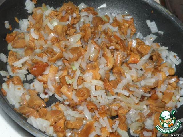 Тем временем мелко накрошенный лук и грибочки обжариваем на растительном масле до готовности |
