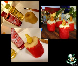 4 марципановые свечи делаем заранее: просто формируем марципан в виде свечки, раскрашиваем красным, а "пламя" - желтым красителями.