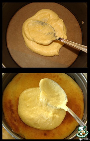 Форму (18 см) застилаем бумагой, выкладываем 1 ст.л. теста и равномерно распределяем по дну.