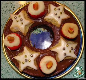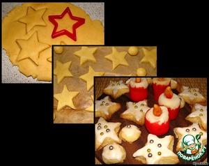 Также заранее делаем украшения для венка: я сделала звезды из обычного песочного теста 1-2-3 + ванилин, обмазала белой глазурью (сахарная пудра + вино/лимонный или другой сок) и украсила сахарными шариками.