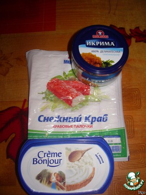 Каждый "корж" смазываем сливочным сыром с икрой, посыпаем крабовыми палочками.