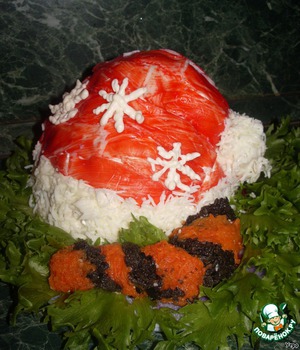 Аккуратно выстилаем колпак срезанными красными частями от крабовых палочек.