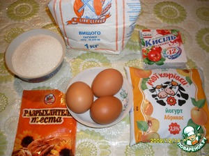 питьевой йогурт, сахар (по вкусу) и муку, смешанную с разрыхлителем. Взбить.