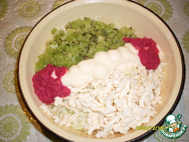 Киви порезать кубиками, сырок потереть на терке, добавить майонез и хрен.