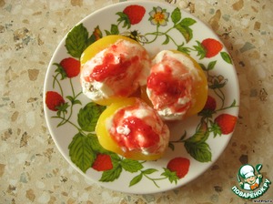 Накладываем мороженое в персики и поливаем сверху клубничным сиропом.