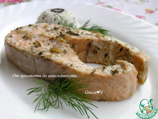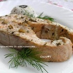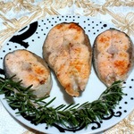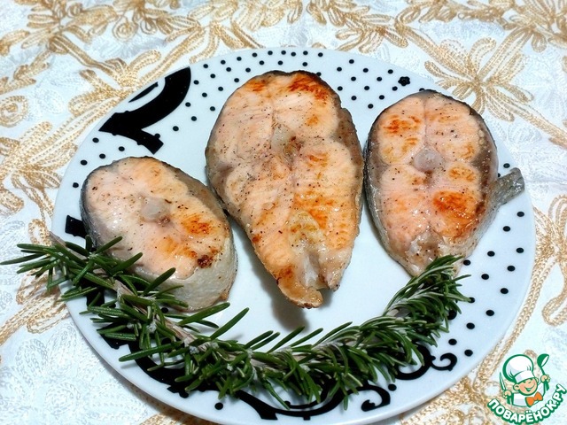 Через полчаса, когда стейки замариновались, их нужно аккуратно выложить на сковородку (рыба очень нежная и может разваливаться) и обжарить на умеренном огне по 5 минут с каждой стороны. На сковородку можно вылить остатки маринада, тогда рыбка точно не подгорит и будет еще нежнее. Точно так же можно поджарить стейк на гриле.