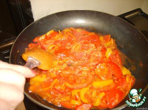 Порезанную соломкой морковь пассеровать 1 мин. на слабом огне. И тут же добавить нарезанный тонкими кружочками перец. Потушить пару минут и добавить порезанные полукольцами помидоры, обжарить и добавить к луку.